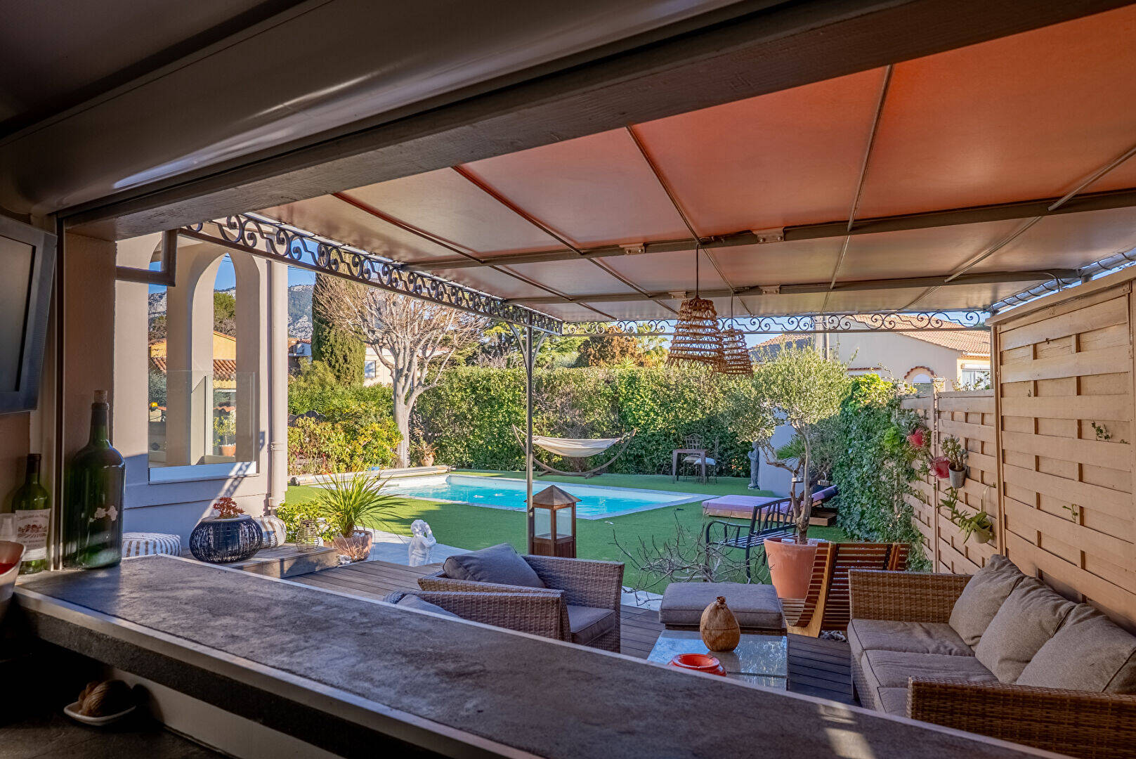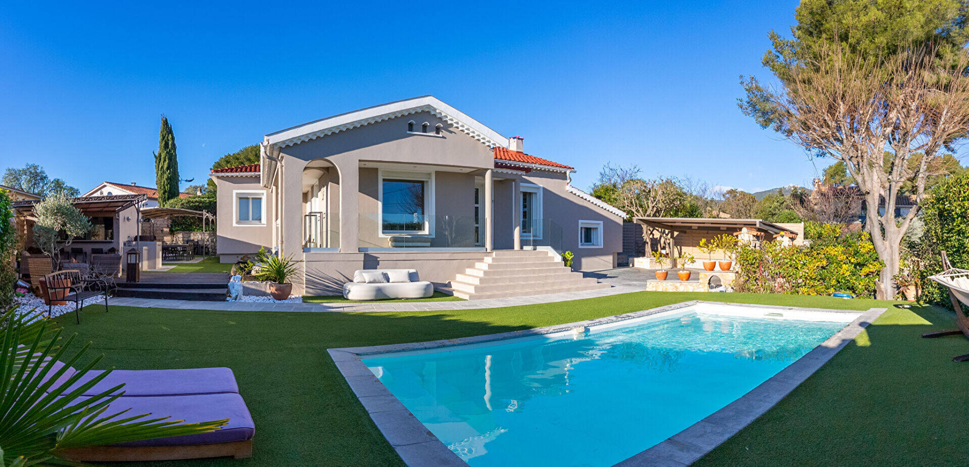 L'ensemble est situé sur une parcelle de 660m² comprenant une piscine chauffée, une cuisine d'été entièrement équipée donnant sur un espace salon et d'un wc extérieur. De plus, un confortable coin repas se trouve sous une pergola.