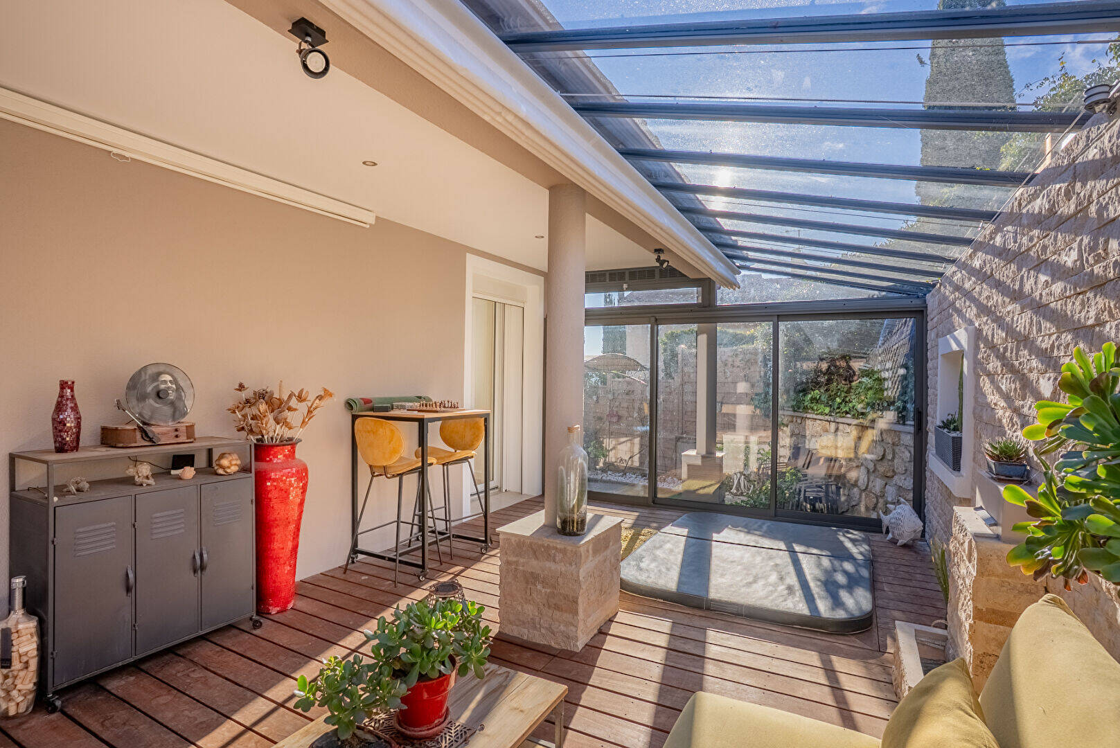 Sur le côté Ouest, vous découvrirez une vaste terrasse en bois équipée d'un jacuzzi, offrant un espace de repos protégé, loin des regards indiscrets.